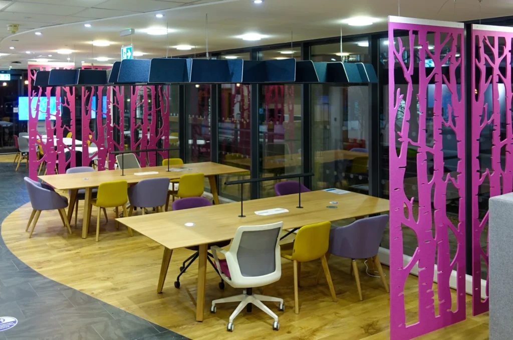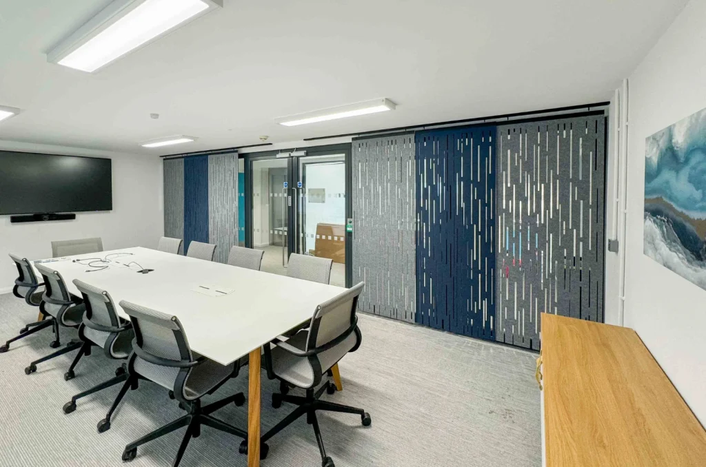 These are decorative hanging acoustic panels – ceiling or wall-suspended panels that combine a strong visual presence with genuine acoustic performance. Each panel is constructed from a dual layer of PET precision-cut with distinctive patterns. Absorbing sound from both faces. They are particularly effective at reducing high-frequency tones – mitigating the impact of chatter, ambient noise, and general clatter in open or communal spaces.