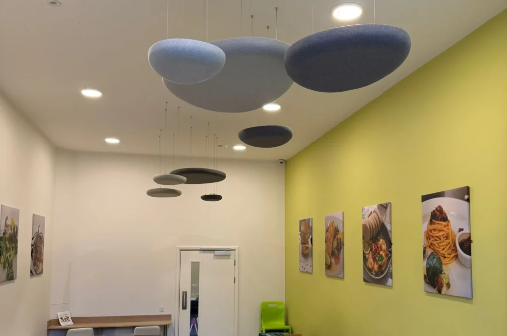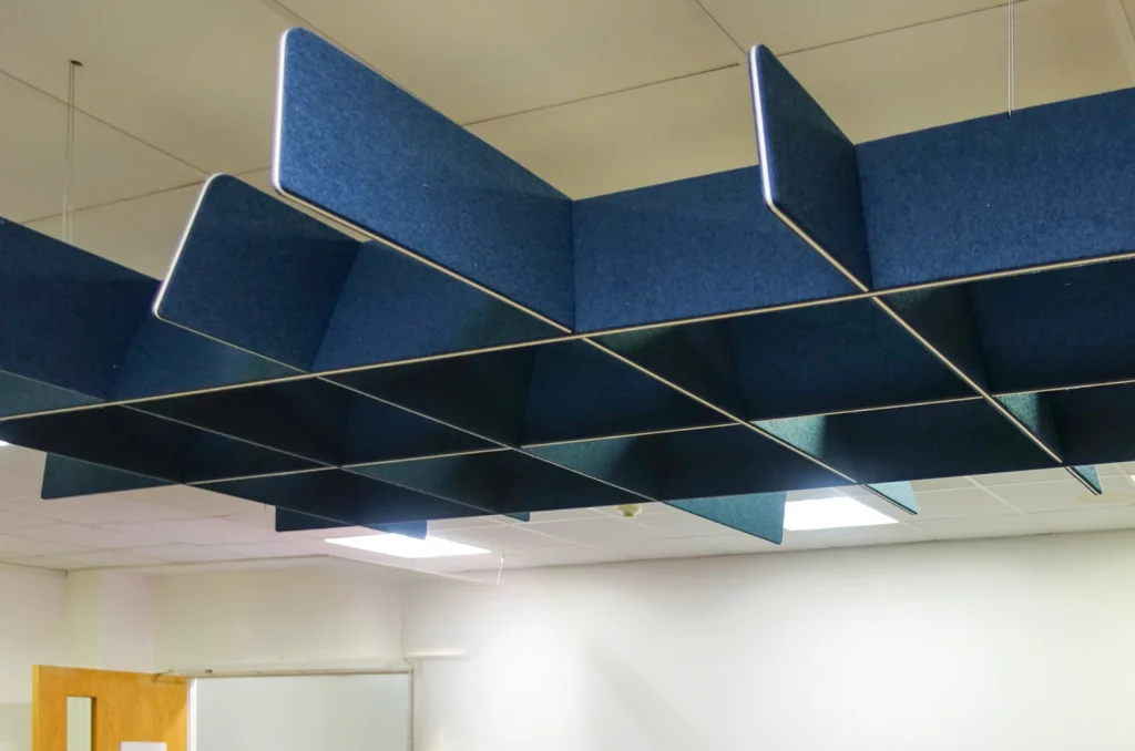 In spaces where walls alone aren’t enough, ceiling-hung panels absorb sound from both faces, reducing reverberation and echo. It’s a great way to solve an acoustic problem when wall space is at a premium. They reduce the sound evently thoughout the area.
